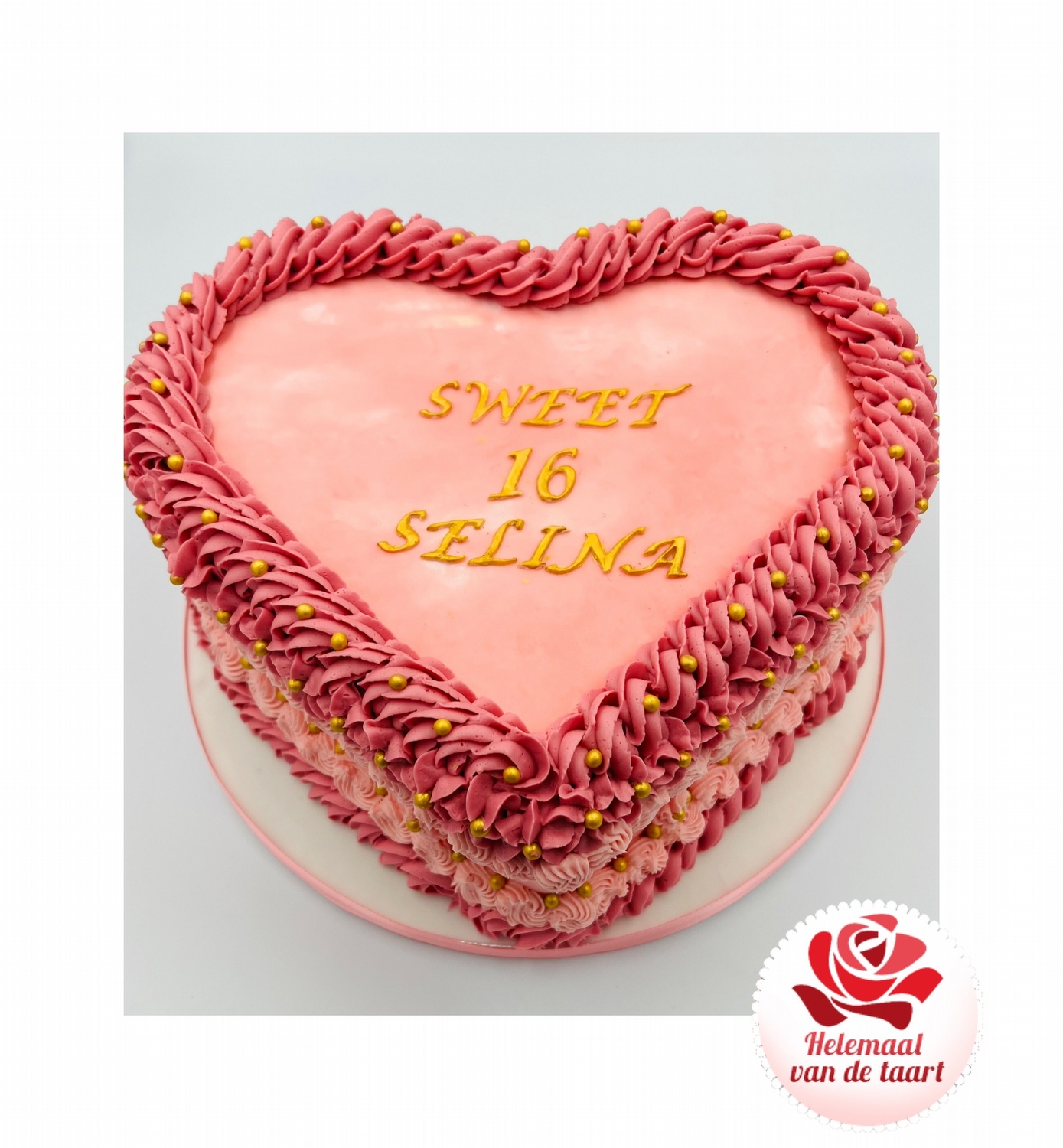Wordt je 16 en wil je een Sweet 16 party geven? Dan hoort daar natuurlijk een mooie taart bij. Bijvoorbeeld in de vorm van een mooi hart met heerlijke roomboterversiering. Alle kleuren zijn mogelijk, en uiteraard ook andere vormen. Kijk op www.helemaalvandetaart.nl en/of vraag naar de mogelijkheden, ze zijn eindeloos!