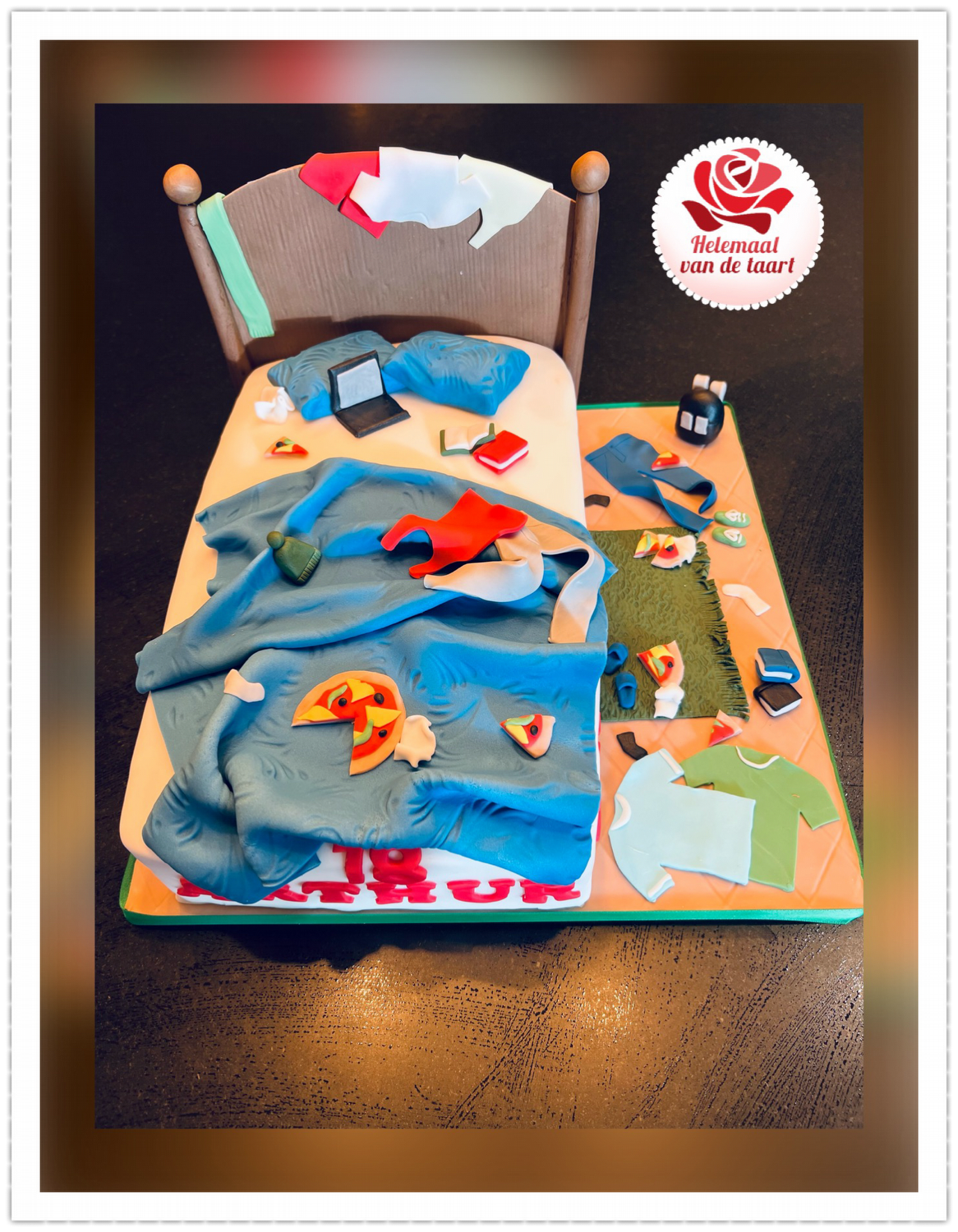 Dat vroeg om een mooie taart, maar hoe gaat die eruit zien? Wat voor thema? Na wat zoeken zag ik een afbeelding van een rommelige slaapkamer, een echte tienerkamer en toen was het idee geboren. Want alledrie hebben ze gemeen dat het echte rommelkonten zijn.